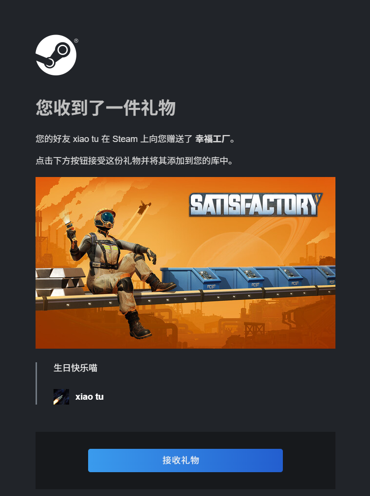 第一份礼物来自小猪:凌晨时分,送了我一款游戏(幸福工厂),同时也是他的生日,也祝贺我们两个共同老了一岁!