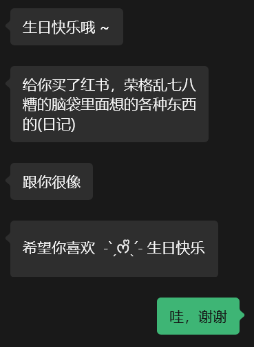 第二份礼物来自简简:凌晨四点,简简送来的祝福与精心选取的礼物(红书——荣格),同时也希望我的3分钟热度能够陆陆续续看完这本书。